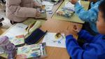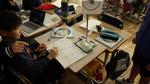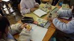 5年生の教室では、振り子の実験をしています。音楽に合わせて振り子を振ります。振り子の1往復する時間はどのくらいか、グループで役割を分担して、実験をしていました。みな真剣に実験をしています。