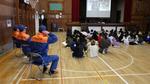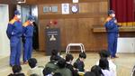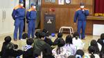 消防隊員が来てくれました。はじめにDVDで、隊員の仕事について説明がありました。人命を救助するため、常日頃から訓練や準備、住民への注意喚起など、いろいろなことをしていることがわかります。