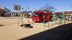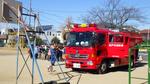 よく晴れた一日。校庭に一台の真っ赤な消防車が到着しました。3年生の社会科で、消防署の出前授業が行われました。
