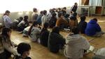 1時間目。5年生がアクティブルームに集まりました。床にビニールテープで3つの長方形が表されています。