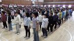 子供たちが体育館に集まりました。みな、始まるまで静かに待っています。