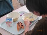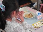 どの子もおいしそうに食事をしています。食事にはマナーがあります。この時間はマナーも身に付け、栄養バランスの取れたメニューを、きちんと食べることも身に付けさせたいと考えています。食物アレルギーのあるお子さんは別として、「好き嫌い」で食べ物を選ぶのではなく、健康な体を作るためには、どんなものを食べればよいのかという観点をもって、食事をしてほしいと思います。