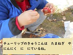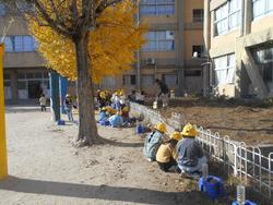 春に向けて、1年生はチューリップとアネモネの球根を植えました。先生のお話を聞いて手順を確かめて、用務員さんに手伝ってもらい土づくりからはじめました。球根を植えるときは、向きに気を付けて深く植えました。アサガオは1週間くらいで芽がでましたが、今度はどのくらいで芽がでるのでしょう。きれいな花がさくように、お世話をしっかりしていきましょう。