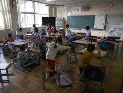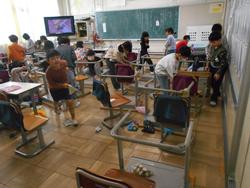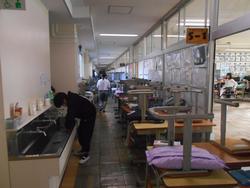 1年生は、机・椅子の脚の掃除を丁寧に行っていました。この後、机・椅子を廊下に出し、教室をきれいに拭き掃除していました。