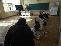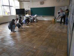 5年生は、机・椅子を廊下に出した後、水拭きとワックスがけをおこなっていました。