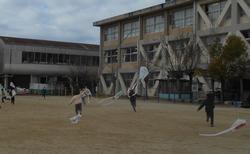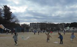 生活科の学習で「かぜとあそぼう」の学習をしました。風車を作ったり、たこを作ったりしました。今日は、学年みんなでたこあげをしました。風があまり吹いていなかったので、走ってとばしました。思った以上に高くあがって糸が伸びたために、木にひっかかってしまう子もいました。糸を結んだり、糸をまいたりする作業は、かじかんだ手では少しむずかしいようでした。友だちがあげやすいように持ってあげたり、仲良く一緒に走ったりして、協力して楽しくたこあげができました。