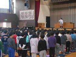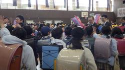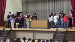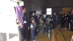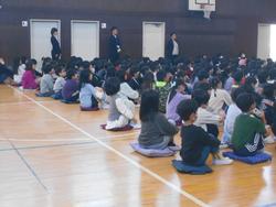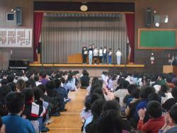 学級活動で後期の通知表を受け取り、今年度を振り返ったり春休みの生活について確認したあとは、卒業生も加わり辞校式です。