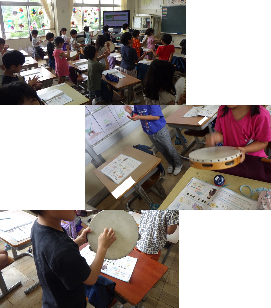 本日、音楽の学習で小学校になってはじめて、タンブリンの合奏を行いました。