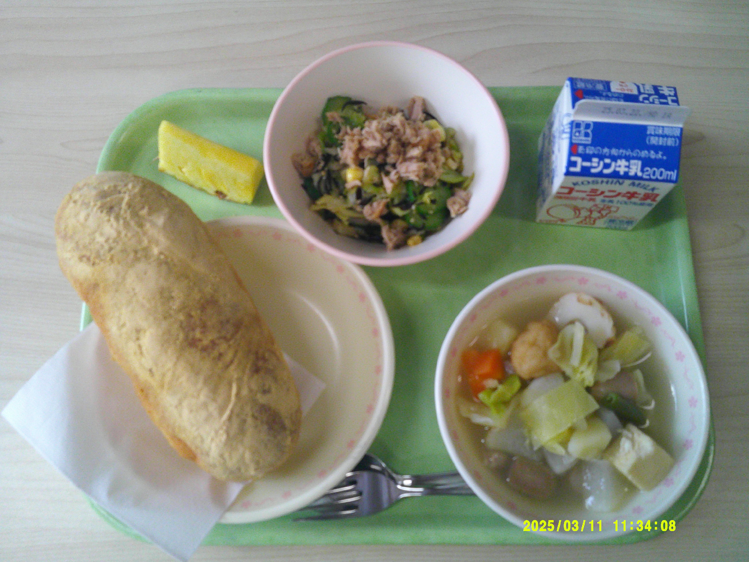| 11 | 火 | きなこつきあげパン ようふうおでん ツナサラダ パインアップル ぎゅうにゅう |