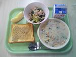 | 2 | 月 | セサミトースト クリームシチュー ツナサラダ りんご ぎゅうにゅう |