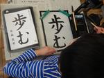 書いた文字とお手本の文字を見比べて、筆の使い方、文字のバランスなどを考えました。