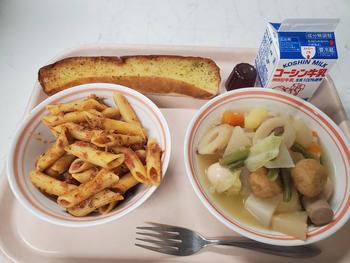 ガーリックフランスパン 鯖のトマトペンネ 洋風おでん 一口ブドウゼリー 牛乳