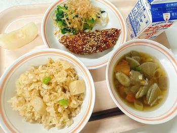 里芋ごはん スズキのフライ 梅おかか和え 根菜汁 梨(豊水) 牛乳