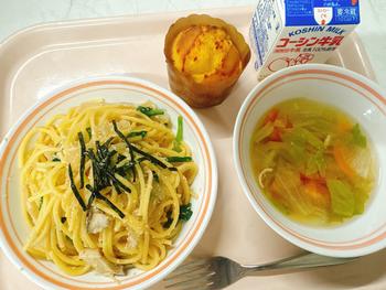 たらこスパゲッティ レタスとトマトのスープ 手作りりんごマフィン 牛乳
