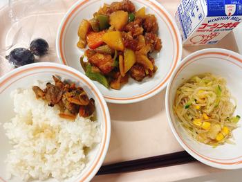 ごはん あさりの時雨煮 黒酢酢豚 春雨サラダ 巨峰 牛乳