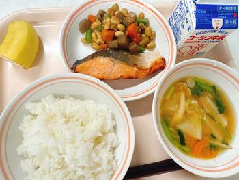ごはん 鮭の塩麹焼き 五目豆 味噌汁 牛乳