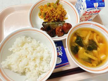 ごはん 鯖のピリ辛焼き 切り干し大根の煮物 かき玉汁 牛乳