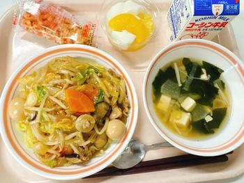 あんかけ焼きそば わかめスープ チーズドック 杏仁フルーツ 牛乳