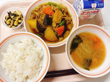 ごはん カレー肉じゃが ひたし豆 味噌汁牛乳