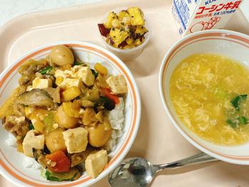 豆腐の中華煮丼 中華卵スープ 豆かりんとう 牛乳