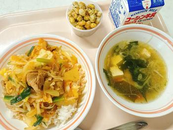 豚キムチ丼 ポップビーンス わかめスープ 牛乳