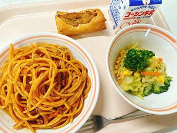 スパゲッティボロネーゼ バジルサラダ 手作りマロンパ 牛乳