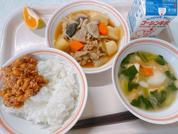 ごはん 大豆の甘辛揚げ 肉じゃが 味噌汁 はるか 牛乳