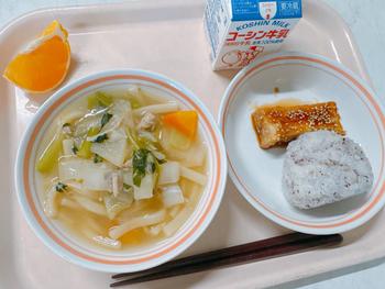 白菜うどん 生揚げのかりん揚げ ゆかりおにぎり 夢オレンジ 牛乳