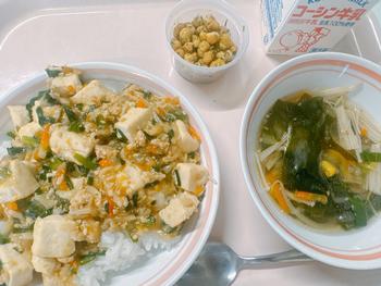 鶏ネギ塩麻婆豆腐丼 ポップビーンズ わかめスープ 牛乳