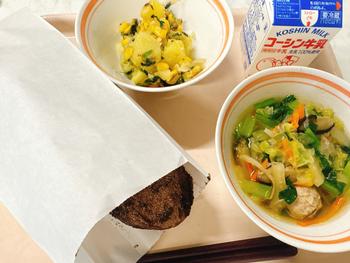ココア揚げパン ジャーマンポテト 手作り肉団子スープ 牛乳