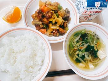 ごはん 白身魚の甘酢炒め 中華スープ はるか 牛乳