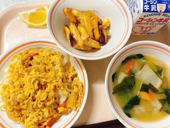 親子丼 おさつバタースティック 味噌汁 はるか 牛乳