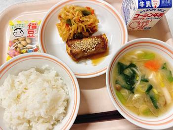 ごはん 生揚げの肉巻き 切り干し大根の煮物 豆乳入り味噌汁 福豆 牛乳
