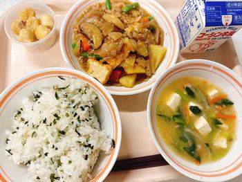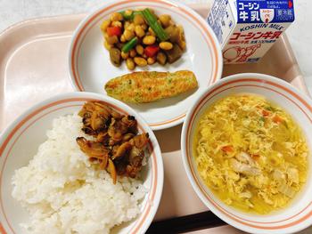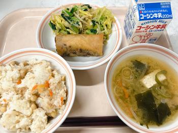 大豆入りツナごはん ひじきの春巻き レモン和え 味噌汁 牛乳