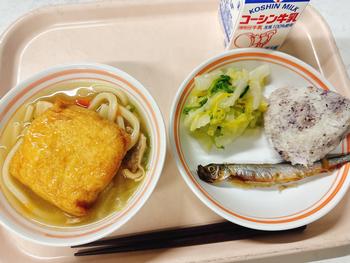 きつねもち入りうどん 焼きししゃも 白菜のゆず漬け ゆかりおにぎり 牛乳