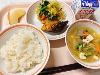 ごはん 鯖の甘露煮 なめたけ和え ごまみそけんちん汁 りんご 牛乳