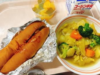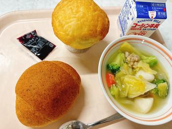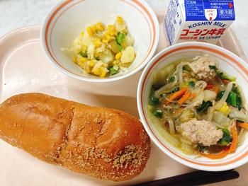 キャラメル揚げパン コーンポテト 手作り肉団子スープ 牛乳