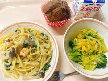 シーフードクリームパスタ バジルサラダ チョコカップケーキ 牛乳