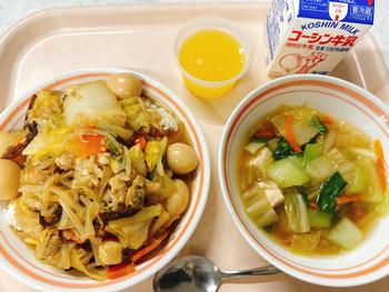 中華丼 春雨スープ 手作りオレンジゼリー 牛乳
