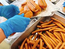 コッペパンにウインナーをはさみ、その上に豆のトマト煮を