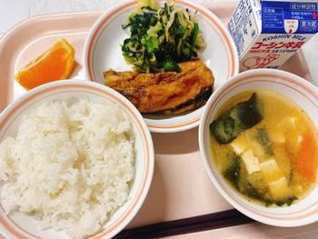 ごはん いわしのかば焼き のり和え 味噌汁 デコポン 牛乳