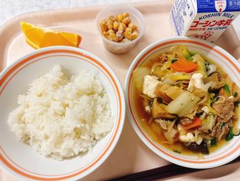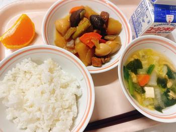 ごはん 豚バラと大根の煮物 味噌汁 オレンジ 牛乳