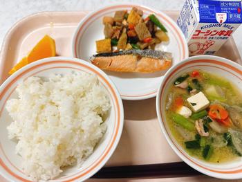 ごはん 鮭の塩焼き 野菜のごま煮 味噌汁 でこぽん 牛乳