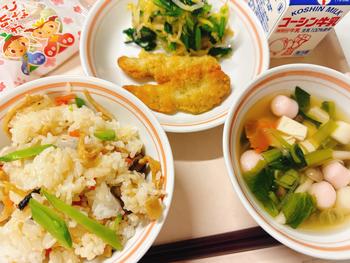ちらし寿司 わかさぎフリッター からし和え すまし汁 ひなあられ 牛乳