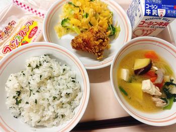 わかめごはん 鶏のからあげ カリポリサラダ さつま汁 クレープ 牛乳