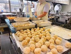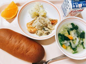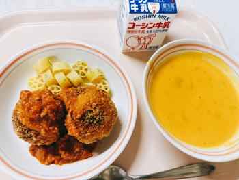 ライスコロッケ(ミートソース添え) マカロニソテー パンプキンポタージュ 牛乳