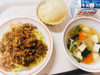ジャージャー麺 わかめスープ さつまいも蒸しパン 牛乳