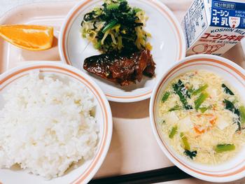 ごはん 鯖の味噌煮 のり和え かきたま汁 きよみオレンジ 牛乳