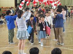 6年生と手をつないで、4年生の作ったアーチをくぐって入場してきた1年生。