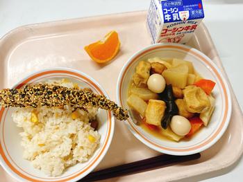 コーン茶飯 ししゃものごま揚げ おでん はるみ 牛乳